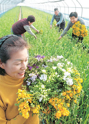 卒業生に手渡される花がすくすく育っている。28日、京畿道利川市戸法面東山里(キョンギド・イチョンシ・ホボプミョン・ドンサンリ)にある東山農園のビニールハウスでは、卒業シーズンに合わせ咲き乱れているフリージアを切る園芸農家の人の顔に微笑が浮かんだ。
