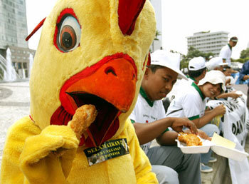 10日、インドネシアのジャカルタで行われた鶏肉の試食イベント。鳥インフルエンザで、アジア各国に非常事態が発生したため、熱を通した鶏肉とアヒルの肉は食べても問題無いとするキャンペーンが盛んに行われている。