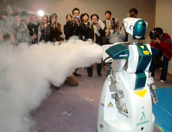 連合保安ロボット「T63APTEMIZ」が16日、日本北九州の試演会長で煙を噴き出している。このロボットを作ったベンチャー会社のTMSUKによれば、T63APTEMIZは前もって入力されたプログラムに従って、建物のあちらこちらを巡察する警備員の役割をするという。自らエレベーターに乗り降りでき、建物の保安センターに直接報告もできる