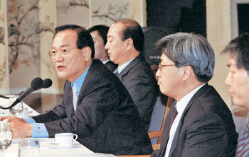 ハンナラ党の崔秉烈(チェ・ビョンヨル)代表(左)は17日、「総選挙で負ければ、当選しても国会議員を辞める」と明らかにした。崔代表が同日午後、ソウル中区(チュング)韓国プレスセンターで開かれた寛勲(クァンフン)クラブ招請シンポジウムでパネリストの質問に答えている。