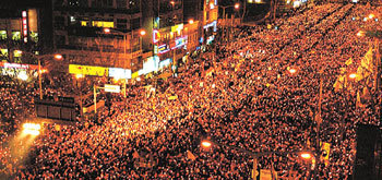 13日午後、盧武鉉(ノ・ムヒョン)大統領の弾劾案可決に反対する市民約7万人がソウル光化門(クァンファムン)一帯の道路に詰め掛け、ロウソク集会を行った。このデモを主導した「弾劾無効腐敗政治訣別のための全国民行動」側は弾劾が撤回されるまで毎晩デモを行うことにした。