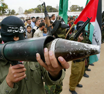23日、覆面を被り、ロケットランチャーの照準をつけるパレスチナ・インティファーダ(住民蜂起)運動所属の「アルーアクサ殉教者旅団」の部隊員。しかし、イスラエルも同日、パレスチナの抵抗勢力に対し「最後まで追跡する」と公言した