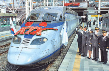 4月1日から運行される京釜(キョンブ)高速鉄道開通式が30日、ソウル駅広場で開かれた。開通式直後、プラットホームを発つ高速鉄道試乗車に向けて、駅員たちが安全運行を祈りながら手を振っている。