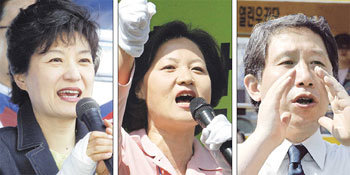 제17대 총선을 하루 앞둔 14일 한나라당 박근혜 대표(왼쪽)는 거대여당 견제론을, 민주당 추미애 선거대책위원장(가운데)은 국정 심판론을, 열린우리당 김근태 원내대표는 탄핵 심판론을 내세워 요동치는 수도권 표심을 잡기 위해 지원유세에 힘을 쏟았다.