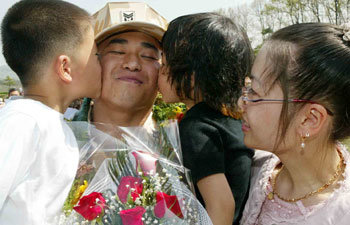 20日、京畿道広州市(キョンギド・クァンジュシ)特電教育団練兵場で開かれたソヒ・ジェマ部隊3陣の歓送式で、一部隊員が家族と別れを告げている。3陣兵力はイラク追加派兵のために選抜されたイラク平和再建師団(ザイトン部隊)の将兵たちによって構成されており、21日と28日に分かれてイラク南部のナッシリアに向けて出発する。