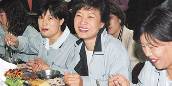 ハンナラ党の朴槿惠(パク・グンヘ)代表(中央)が総選挙後、民生向上に向けて本格的な歩みに取り組んだ。朴代表は22日、仁川南東(インチョン・ナムドン)公団のセイル電子勤労者らと昼食を共にしながら、「勤労者が豊かに暮らせる国が本当に豊かな国」と述べた。
