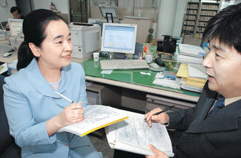 26日から、ソウル江南区(カンナムグ)など4地域で「住宅取引届出制」が行われることから、行政担当者たちも忙しくなった。江南区役所の地籍課土地管理チームのナ・スンイルチーム長(右)が、同日逸院(イルウォン)1洞の役所を訪れ、住宅取引届出の担当者に届出方を説明している。