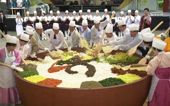 3日、第46回豊南(プンナム)祭りが開かれた全羅北道全州市校洞(チョルラブクト・チョンジュシ・キョドン)にある慶基(キョンギ)殿前で金完柱(キム・ワンジュ)全州市長らが2004人前の超大型ビビンパを作っている。器の大きさが高さ1m、直径3mもある。お米80kg入りの10俵(800kg)、お肉60kg、卵2004個、コチュジャン60kg、醤油とごま油6kg、大根の千切りキムチ30kg、モヤシやワラビ、シイタケなど各種ナムル150kgが入った。全州市はこのビビンパを世界ギネスブックに登録を申し込む予定だ。