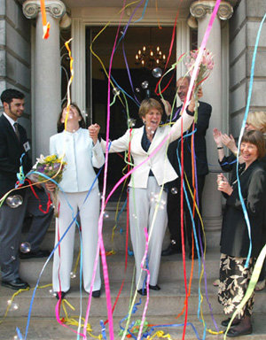 米マサチューセッツ州は17日、同性結婚を合法化した米国内では初めての州になった。同日、2人の女性がマサチューセッツ州ボストン市のある教会で結婚式をあげた後、祝賀を受けている。