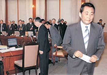 高建(コ・ゴン)国務総理が25日、大統領府で開かれた国務会議で辞任の挨拶をした後、国務会議場を出ている。すぐ後ろに盧武鉉(ノ・ムヒョン)大統領と李憲宰(イ・ホンジェ)国務総理権限代行が首を下げたまま立っている。