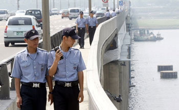 9日、ソウル龍山(ヨンサン)警察署所属の警備隊が、漢江(ハンガン)への飛び降り事故を予防するため、盤浦(バンポ)大橋をパトロールしている。龍山警察庁は、最近社会指導層の要人および一般人の飛び降り自殺が相次いで発生すると、これを防ぐため、盤浦、漢南(ハンナム)、漢江大橋に警備隊を配置した。