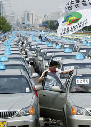 民主タクシー労組連盟は、16日全国で1万人あまりが参加するゼネストに突入した。同日、全国でタクシー2000台あまりが、全国民主労働組合総連盟の集会が開かれたソウル汝矣島(ヨイド)に終結し、車両デモを行った。