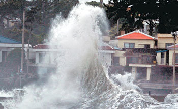北上中の6号台風の間接的な影響で20日、済州道西帰浦市(チェジュド・ソギポシ)ボブファン洞の潟で巨大な波が人家を襲うかのように押し寄せている。台風と西海上で発達した低気圧の影響で19、20日全国的に大雨が降ったが、幸いにも大きな被害はなかった。