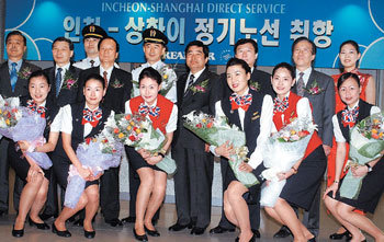 大韓航空は仁川(インチョン)〜上海定期路線の就航を記念して28日、仁川国際空港で鉠宇鉉(チョ・ウヒョン)仁川空港公社社長(中間列左から二番目)と李鍾熙(イ・ジョンヒ)大韓航空社長(中間列左から三番目)らが参加したなか、就航式を行った。大韓航空は仁川〜上海路線を週10回運航する。