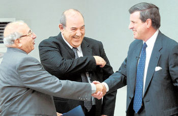 イラク主権が1年2ヵ月19日ぶりに米軍政からイラク暫定政府に移譲された。28日、イラク・バグダッド中心部の安全地帯(グリーンゾーン)の臨時政府で、ポールブリマー米軍政最高行政官(右)がイラク最高裁判所の院長(左)に主権委譲の文書を渡した後、握手している。中央は暫定政府首相。