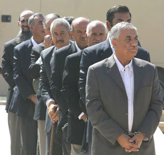 1日、法廷に出頭したサダム・フセイン氏の側近11人が手錠をはめたまま順番を待っている。一番前が元イラク軍情報司令官兼バグダッド市長、二番目が元大統領補佐官。