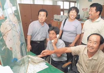 5日午後、忠清南道公州市長岐面(チュンチョンナムド・コンジュシ・チャンギミョン)の役所に集まった住民が地図を広げて、新行政首都に変わる村の未来について話しあっている。