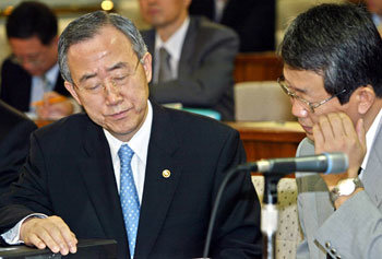 潘基文(バン・ギムン)外交通商部長官(左)が23日、国会の「金鮮一(キム・ソンイル)国政調査特別委」会議に出席し、金鮮一さん殺害事件に対する外交部の対応を報告した。
