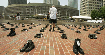 9・11テロからイラク戦争まで。安保問題が米大統領選の最大のキーワードに浮上した。民主党党大会(26日)を4日後に控えた22日、大会が開かれるボストンの市庁前広場でイラク戦で犠牲になって兵士らの名札が付けられた軍靴が展示された。