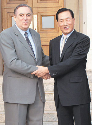 第10回未来韓米同盟政策構想(FOTA)2日目の会議に出席した両国関係者が、23日に合同記者会見を開いた。前日の会議に先立ち、安光瓚(アン・グォンチャン)国防部政策室長(右)と米国防総省のリチャード・ローリス副次官補が握手している。