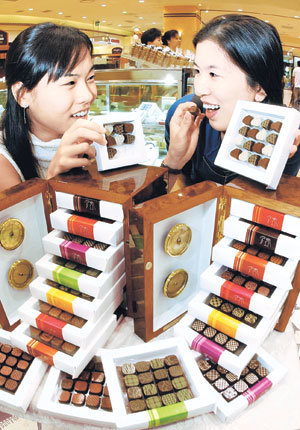 新世界(シンセゲ)デパートのソウル江南(カンナム)店は7日、99万ウォンもする高級チョコレートセットを販売開始した。湿度と温度を最適の状態に維持するフランス産ニレで作った保管ボックス(70万ウォン相当)に、チョコレートを7段(1段に16個)で積み上げたため価格が高くなったと言うのがデパート側の説明。5セットだけ限定販売し、保管ボックスの中にはメッキされた温度計と湿度計が取り付けられている。