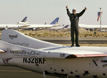 先月29日、米国の民間有人宇宙船「スペースシップワン」の試験飛行を終えて帰還した操縦士マイク・メルビール。今回の飛行は、米国「Xプライズ」協会が1000万ドルの賞金をかけて開催した民間人宇宙旅行大会に参加するために行われた。大会優勝のためには3人の宇宙人を乗せて大気圏100kmの上空で、2週間に二度の宇宙旅行をしなければならない。
