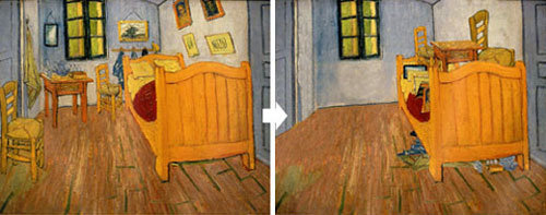 ウルジュス・ベアリーという人がいる。コメディアン、エンターテイナー、デザイナーを兼ねたスイス生まれの芸術家だ。最近、彼のする遊びがどこか母の仕事に似ている。まず絵の①を見てみよう。誰もが知っているようにアルルに住んでいた時代のビンセント・バン・ゴッホの寝室だ。作業をするときの私の部屋同様、画家の部屋もずいぶん散らかしてある。ベアリーはこれを我慢できなかった。散らかしてある部屋をきれいに片付けた。椅子とテーブル、そして額縁はベッドの上に上げて、その他の雑多な物はベッドの下に隠した。何をどこに隠したのか探してみよう。