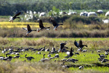 環境部の保護野鳥である雁約1万匹が冬越しのために南下し、刈りを終えた京畿道金浦市(キョンギド、キンポシ)の金浦平野でのんびりとえさを探している。
