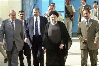 イラク暫定政府のイヤド・アラウィ首相(左)が17日、バグダッド郊外のシーア派地域であるサドル市を訪問して、シーア派聖職者のフセイン・アル・サドル(右から二番目)の出迎えを受けている。アラウィ首相は武器撤去が行われているサドル市内の競技場も訪問する予定だったが、到着15分前に迫撃砲弾攻撃があったため日程を取り消した。