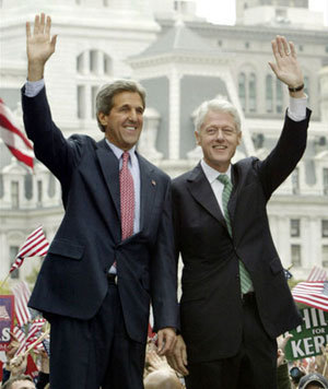 ビル・クリントン前米大統領(右)が25日、ペンシルバニア州フィラデルフィアのジョン・ケリー民主党候補の遊説に合流した。心臓手術を受けてから7週間ぶりだ。