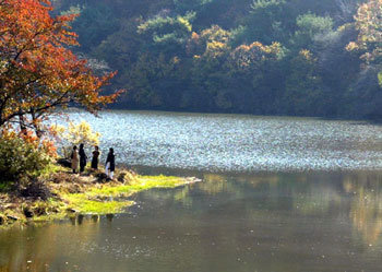 29日、京畿道龍仁市(キョンギド、ヨンインシ)のエバーランド付近のホアム湖を訪れた市民たちが、穏やかな湖に映った紅葉を見物し、秋の趣を満喫している。気象庁は、週末は快晴で昼の気温が20℃を上回るなど、紅葉を鑑賞するのに最適の天気になると予報した。