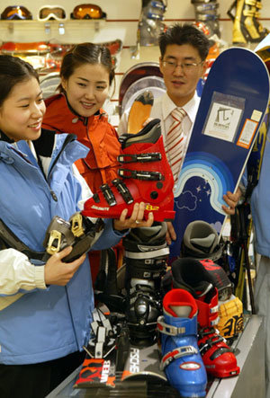 ウインター・スポーツのシーズンが近づくや、各デパートではスキーやスノーボードの専門売り場を開設し、繰り越し商品の割引行事を催した。新世界(シンセゲ)デパートのソウル江南(カンナム)店で4日、客がスキーブーツを選んでいる。