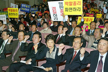 4日、国会議員会館の大会議室で野党ハンナラ党の朴槿恵(パク・グンヘ)代表(前列中央)と党所属議員らが、李海瓚(イ・ヘチャン)首相の解任を求めてスローガンを叫んでいる。