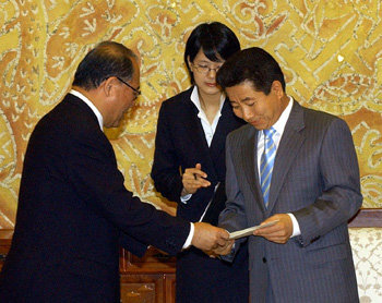 盧武鉉(ノ・ムヒョン)大統領(右)が6日、大統領府で武部勤自民党幹事長から小泉純一郎首相の親書を受け取っている。