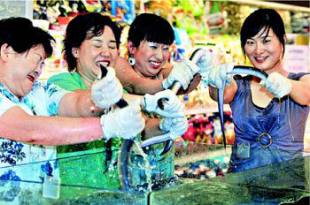 ロッテデパートは25日、ソウル江南区大峙洞(カンナムク・テチドン)の江南店でうなぎを10秒以上握り続けることのできた人にうなぎを3割引きで提供する「うなぎ握り大会」を催した。買い物客たちが暴れるうなぎを捕まえようと必死になっている。