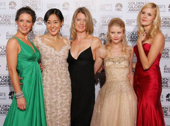 16日、米ロサンゼルスで開かれた第63回ゴールデングローブ賞の授賞式で、ABC放送のドラマ『ロスト』に出演した韓国女優金ユンジン(左から2番目)が、他の女優らと一緒に明るく微笑んでいる。同日の授賞式で、同ドラマはテレビ部門の最優秀作品賞を受賞する栄誉を受けた。