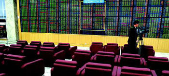 株価が暴落した23日、ソウル・永登浦区汝矣島洞(ヨンドゥンポグ・ヨイドドン)にある大信(テシン)証券の店頭が閑散としている。コスタック市場は10%以上下落した状態が1分間続き、史上初めて株式取り引きを20分間停止させるサーキットブレーカーが発動した。投資家が一人もいない店頭で取材しているテレビ局のカメラマンが、相場ボードを撮影している。