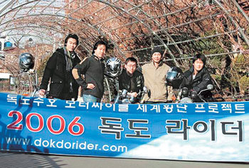 独島(トクト)が韓国領土であることを知らせるため、世界横断に挑戦する李ガンソク(左)さんなど、独島ライダー所属の大学生5人がファイトを叫んでいる。