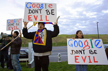 25日、米国カリフォルニア州マウンテンビューのグーグル(Google)本社の前で、チベットの自由化のための学生団体のメンバーたちが「邪悪にならないで」と書いたピケットを持って抗議デモをしている。「邪悪にならないで」はグーグルのモットーになぞらえたもの。世界最大手のインターネット検索エンジンであるグーグルが、同日から中国語版アドレスに変え、天安門事件、チベット、パルングング、人権問題など政治的にデリケートな単語に対する検索を遮断したが、これに対して世界各地から非難が殺到した。グーグルは中国での立地強化のために不可避な措置だったと説明した。