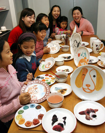 丙戌年の犬年を迎えて31日、ある陶磁器メーカーが主催したハンドペインティング教室で、子供たちが陶磁器に様々な模様の子犬を描き入れている。