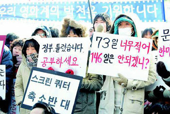 8日午後1時半、ソウル世宗路(セジョンロ)の東和(トンファ)兔税店ビルの前で映画人と市民など2000人余りが、政府のスクリーンクォーター縮小方針に抗議する「文化侵略阻止及びスクリーンクォーターを守るための映画人大会」を開いた。同席にはチェ・ミンシク、李ビョンホン、ファン・ジョンミン、チョン・ドヨン、金ソンア、文根英(ムン・グンヨン)、ヒョン・ビンなど100人余りの俳優と林權澤(イム・グォンテク)、李ジュンイック、ソン・ヘソン、洪尚秀(ホン・サンス)、李在容(イ・ジェヨン)監督らが参加した。映画人たちは抗議する意味で同日、映画の撮影を中断した。