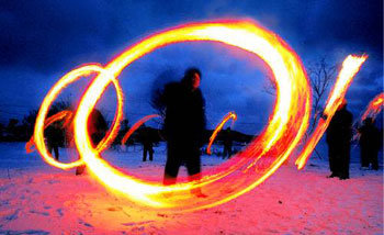 小正月(12日)を控え、9日、全羅南道咸平郡月也面(チョルラナムド・ハムピョングン・ウォリャミョン)の月見公園で、村の青年たちが、畔に火を放った後、火の缶を回している。これは、小正月の前日、田畑の畔に火を放ち、農作物に被害を与えるネズミや害虫、悪鬼を追い払う風習だ。農民の望みどおり豊作になり、いい一年になってほしい。