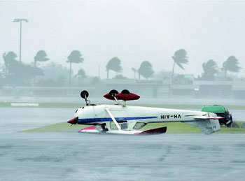 超大型サイクロンのラリーが20日、豪州の北東部海岸を襲い、3人以上が負傷し、2000人あまりが避難した。最大風速が時速300kmである最高等級(5等級)サイクロンのラリーは、強風と暴雨を伴っている。同日強風で転覆したクイーンズランド州・ケアンズ空港の小型飛行機。