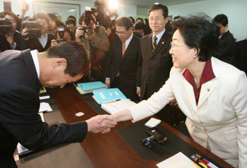 韓明淑(ハン・ミョンスク)首相候補者(右側)が27日、国会人事聴聞会にそなえ、首相室の業務現況を把握するため、ソウル市鐘路区昌成洞(チョンログ・チャンソンドン)政府中央庁舎別館3階に設けられた臨時事務室に初出勤した。韓候補者が首相室幹部と握手をする。