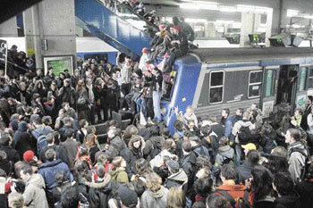 フランスで最初雇用契約(CPE)法に反対する大規模ストとデモが起こった28日、西部都市のレンで学生らが鉄道駅を占拠し、汽車の上にまで上がってデモを行っている。「黒い火曜日」と呼ばれた同日、フランス全域で約100万人がデモに参加した。