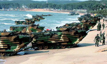 29日、忠清南道泰安郡(チュンチョンナムド・テアングン)萬里浦(マンリポ)海水浴場一帯で、韓米両国の海兵隊が上陸装甲車を利用した合同上陸作戦の訓練を行っている。同訓練は、有事の際、米軍の増員戦力の迅速な韓半島展開のため、25日から進行中の韓米連合戦時増員(RSOI)訓練の一環。本訓練は30日実施される。