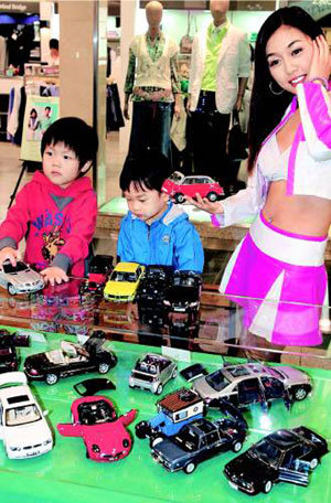 2日、ソウル陽川区(ヤンチョング)の現代(ヒョンデ)デパート木洞(モクトン)店の地下2階「ヤングシティーモール」で、子供たちがレーシングギャルの説明を聞きながら、「ミニアチュアモーターショー」に出品された世界の名車ミニアチュアを見物している。同イベントは16日まで開かれ、展示されているミニアチュアも販売される。