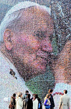 ヨハネ・パウロ2世前法王の一周忌を向かえ1日、観光客らがポーランド南部クラクフのシフランチシュカンスカ街に展示されたヨハンネス・バウロ2世の壁画に追慕している。クラクフはヨハネ・パウロ2世が生前、主教として奉職していた教区。同壁画は、ヨハンネス・バウロ2世の小さい写真をつけて作った。