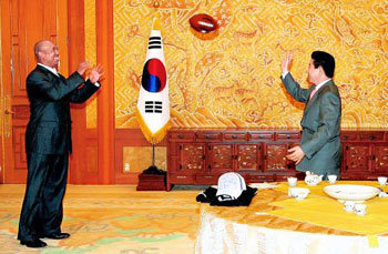 盧武鉉(ノ・ムヒョン)大統領(右)は4日、大統領府で、訪韓中の米ナショナル・フットボール・リーグ(NFL)の韓国系スター、ハインス・ウォードと彼の母親を昼食に招いた。昼食会の前に盧大統領が、ウォードがプレゼントしたボールを投げている。