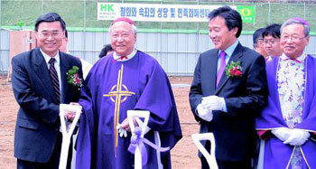 カトリック・ソウル大教区民族和解委員会は8日、京畿坡州市炭縣面(キョンギ・パジュシ・タンヒョンミョン)統一丘で鄭鎮奭(チョン・ジンソク)枢機卿(左側から二番目)の執典で「懺悔と贖いの聖堂及び民族和解センター」着工ミサと起工式を行った。起工式に出席した鄭枢機卿と孫鶴圭(ソン・ハクギュ)京畿道知事(右側から二番目)、李鍾奭(イ・ジョンソク)統一部長官(一番左側)がショベルで土を撒いた後、並んで立っている。